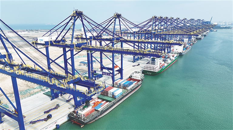 11月24日,在洋浦区域国际集装箱枢纽港扩建工程(一阶段)二期泊位,多艘集装箱轮船停靠在泊位上作业。