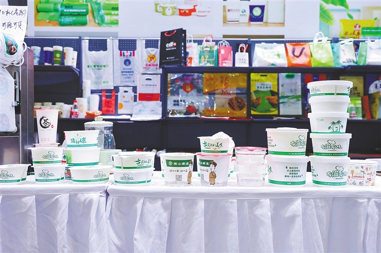 参展商现场展示的全生物可降解塑料制品产品。受访者供图