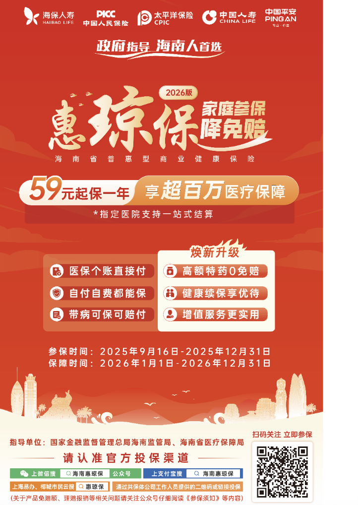 2026年度“惠琼保”参保将于2025年12月31日截止。尚未办理参保的海南人民可通过官方参保平台“海南惠琼保”微信公众号,为本人及其父母、配偶、子女统一办理参保,也可以通过支付宝、海易办、海南农商行、云闪付、椰城市民云在线参保,还可以通过13家共保体公司的专业工作人员咨询参保。