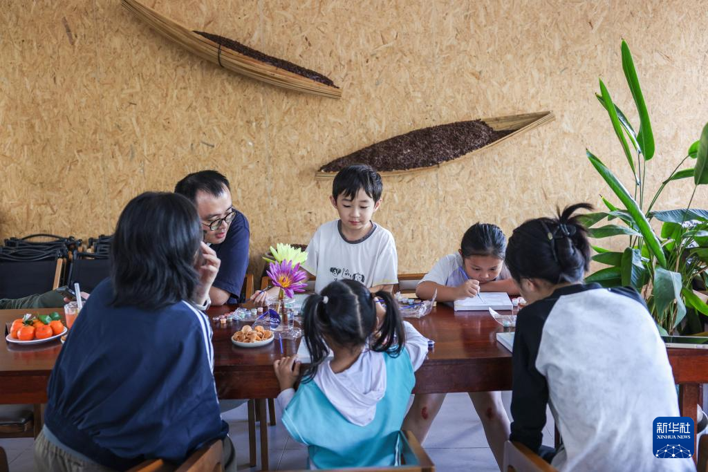 1月27日,小朋友在海南定安县富文镇的九所会客厅水塔咖啡馆里体验绘画课程。新华社记者 张丽芸 摄