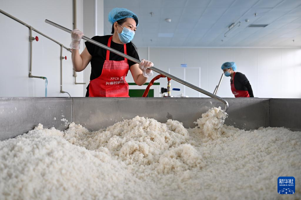 1月28日,文昌溪北邦兴食品科技有限公司糟粕醋加工厂的工作人员在给蒸熟的大米降温。大米是制作糟粕醋的主要原材料。新华社记者 郭程 摄