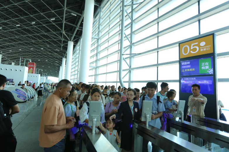 图为海口新海港客运综合枢纽投用后,旅客正在通过安检,海口新海港实行人车分离作业模式,人员直接通过廊桥登上船舶。