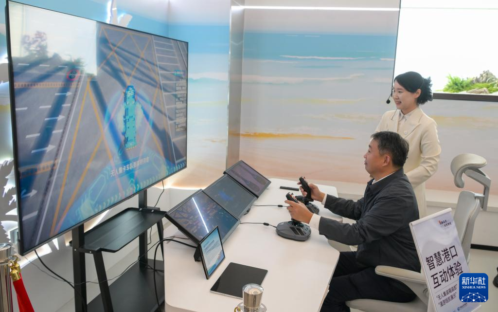 3月19日,观众在“一带一路”主题数字展上进行智慧港口互动体验。新华社记者 杨冠宇 摄