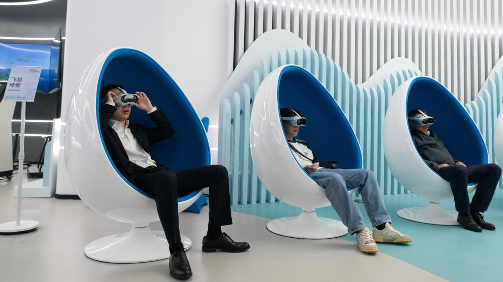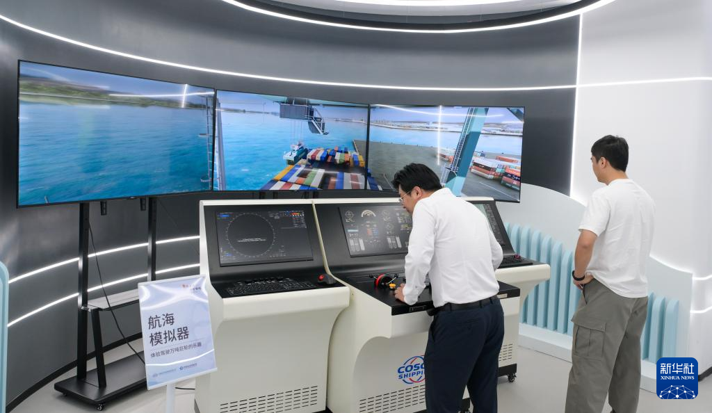 3月19日,观众在“一带一路”主题数字展上体验航海模拟器。新华社记者 杨冠宇 摄