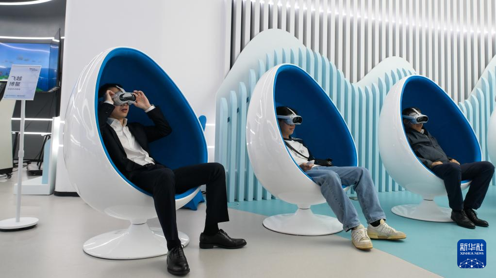 3月19日,观众在“一带一路”主题数字展上沉浸式体验“飞越博鳌”。