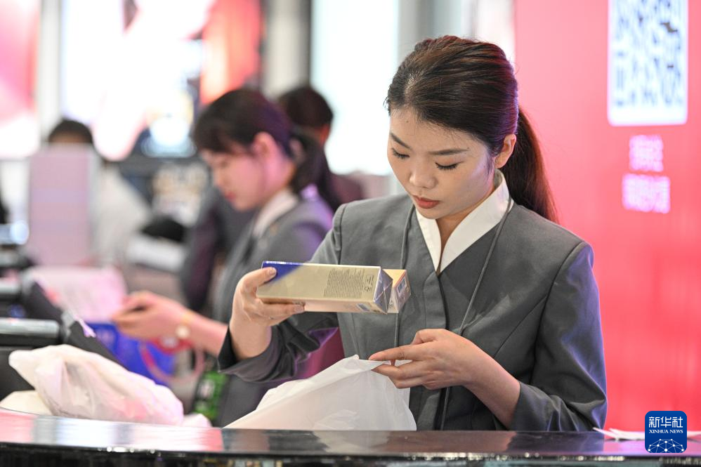 3月27日,店员在海南博鳌免税店为顾客打包商品。新华社记者 蒲晓旭 摄