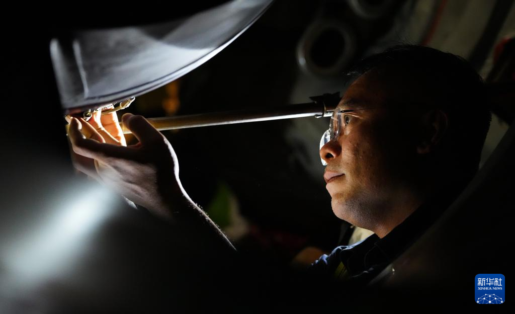 在海口美兰国际机场停机坪上,南航工程技术分公司机务工程师对“消博号”彩绘飞机进行深度检查(4月4日摄)。新华社记者 杨冠宇 摄